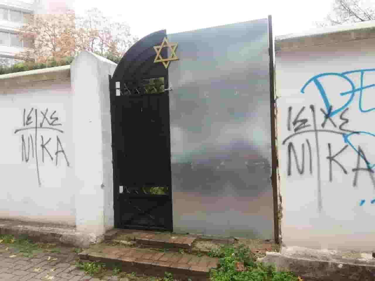 “Το απόγευμα της Πέμπτης 3/12/2020 στις 16:00, ένας ρασοφόρος μέσης ηλικίας βεβήλωσε το Μνημείο Θυμάτων Ολοκαυτώματος στη Λάρισα. Κρατώντας μπροστά στο σώμα του μια θρησκευτική εικόνα, σχημάτισε με μαύρο σπρέΙ το σύμβολο της φράσης «Ιησούς Χριστός Νικά» Στη συνέχεια σχεδίασε 2 φορές ακόμα το ίδιο σύμβολο στον τοίχο του περίβολου της Συναγωγής, που βρίσκεται αυτή την εποχή σε στάδιο αναστήλωσης.
