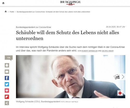 Στη συνέχεια της συνέντευξης μάλιστα, ο Σόιμπλε επισημαίνει: «Όταν ακούω ότι όλα υποχωρούν μπροστά στην προστασία της ανθρώπινης ζωής, πρέπει να πω ότι αυτό δεν είναι απόλυτο. Υπάρχει στάθμιση και αλληλοπεριορισμός στα ανθρώπινα δικαιώματα. Εάν υπάρχει μία απόλυτη αξία στο Σύνταγμά μας, αυτή είναι η ανθρώπινη αξιοπρέπεια. Αυτή είναι απαραβίαστη. Αλλά αυτό δεν αποκλείει ότι κάποτε θα πεθάνουμε…»